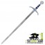 A three lion shield crest of King Richard is proudly centered on one side of the guard, and a Celtic cross shield crest centered on the opposite. The handle is of deep blue leather wrap with antiqued silver inlays. The pin-wheel pommel bears the insignia "Robin of Locksley" on one side and "Earl of Huntington" on the other; housing a deep blue crystal sapphire jewel in its center.