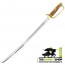 This reproduction of a Russo-Japanese Kyu Gunto military saber has a blade of tempered high carbon steel which is durably mounted into a hilt of brass with a leather-bound wooden grip. Bands of copper wire inlay and a button-activated locking mechanism that secures the hilt to the scabbard complete the sword. Included is a steel scabbard with a steel hanging ring.